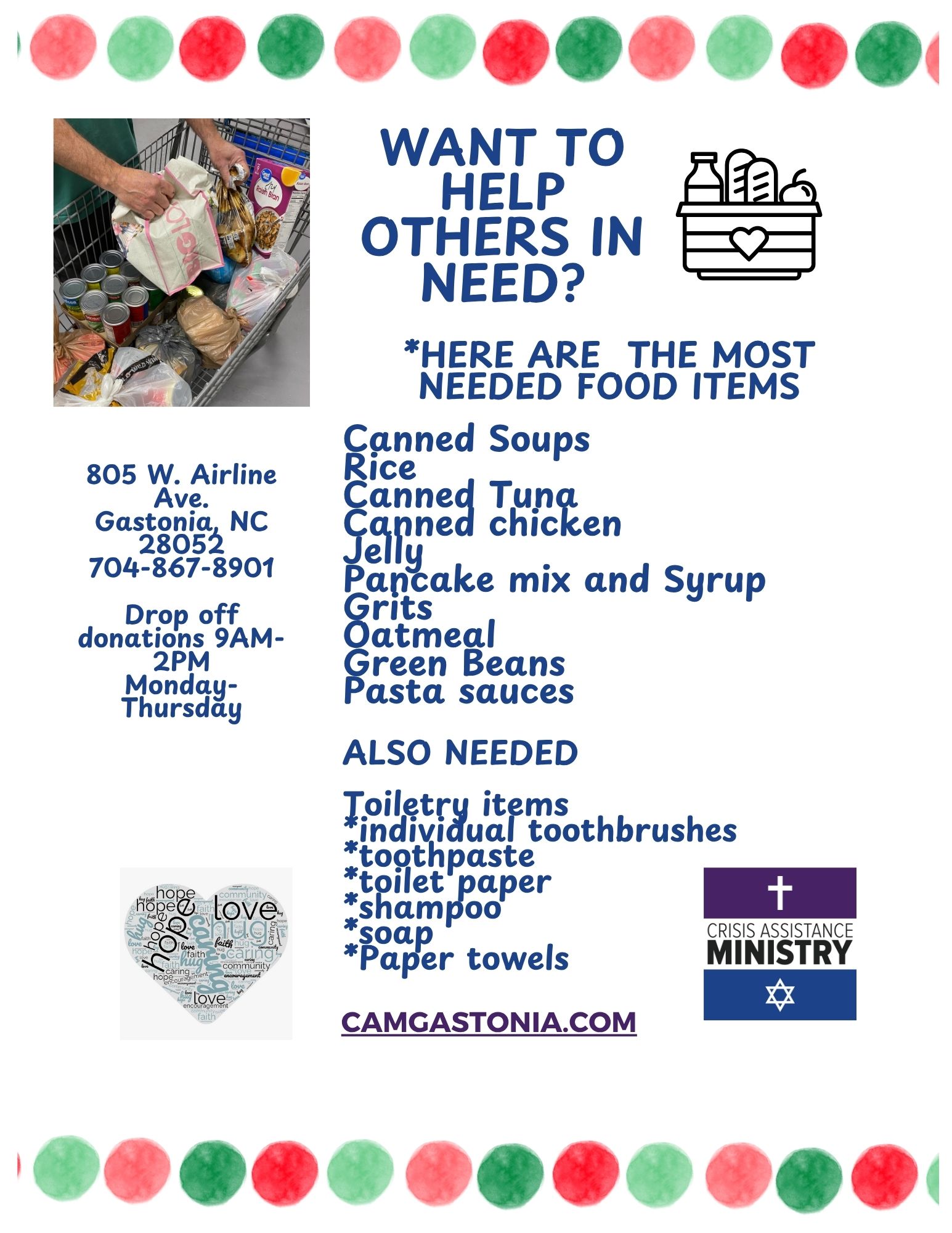 Most needed items: Chicken Noodle Soup, Tomato Soup, Rice, Drive Beans, Instant Potatoes Canned Tuna, Canned Chicken, Ramen Noodles, Jelly, Pancake Mix and Syrup, Oatmeal, and Grits.