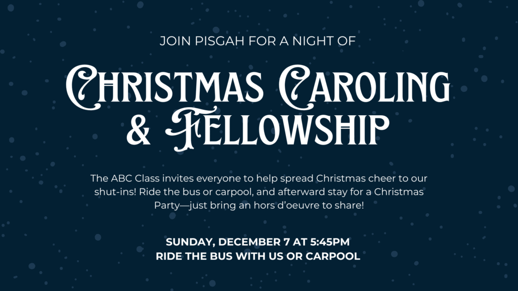 The ABC Class invites everyone to help spread Christmas cheer to our shut-ins! Ride the bus or carpool, and afterward stay for a Christmas Party—just bring an hors d’oeuvre to share!