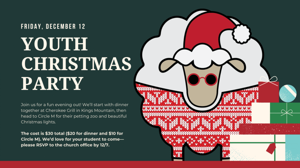 Join us for a festive evening as we walk through Christmastown together! We’ll meet at Burger King (200 Market St, Cramerton) at 6 PM and then stroll through McAdenville as a church family.