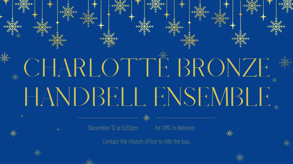 You’re invited to join us for a beautiful afternoon of music as we attend the Charlotte Bronze Handbell Ensemble Concert at First United Methodist Church in Belmont. This talented group is known for their stunning arrangements and rich, uplifting sound—perfect for the Christmas season. Admission is free, and we’d love to enjoy this event together as a church family.