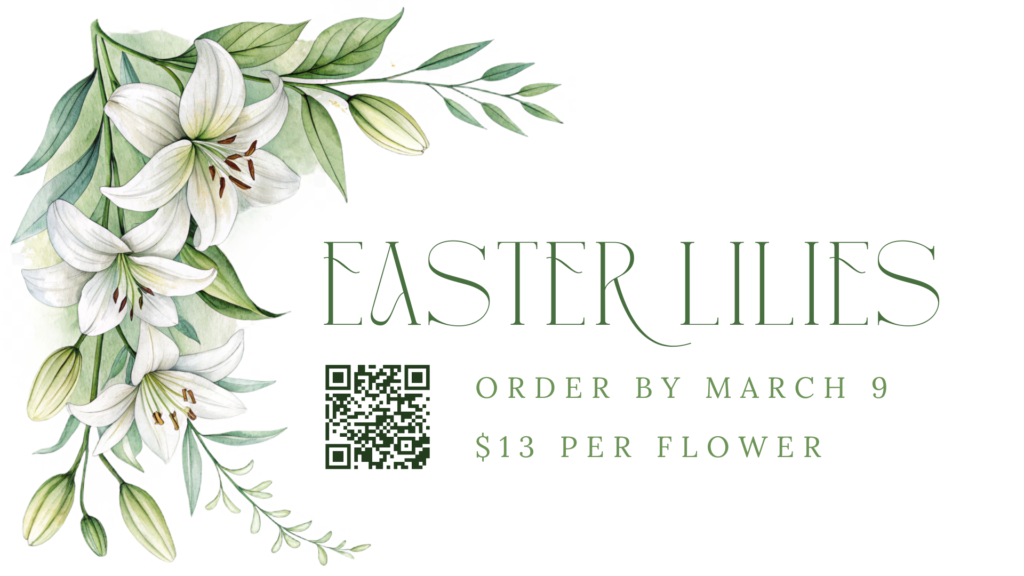Help us prepare the sanctuary for Easter by ordering a beautiful Easter Lily in honor or memory of a loved one. Lilies may be ordered online or by completing a paper order form available in the church office or by contacting sherry@pisgaharpchurch.org.